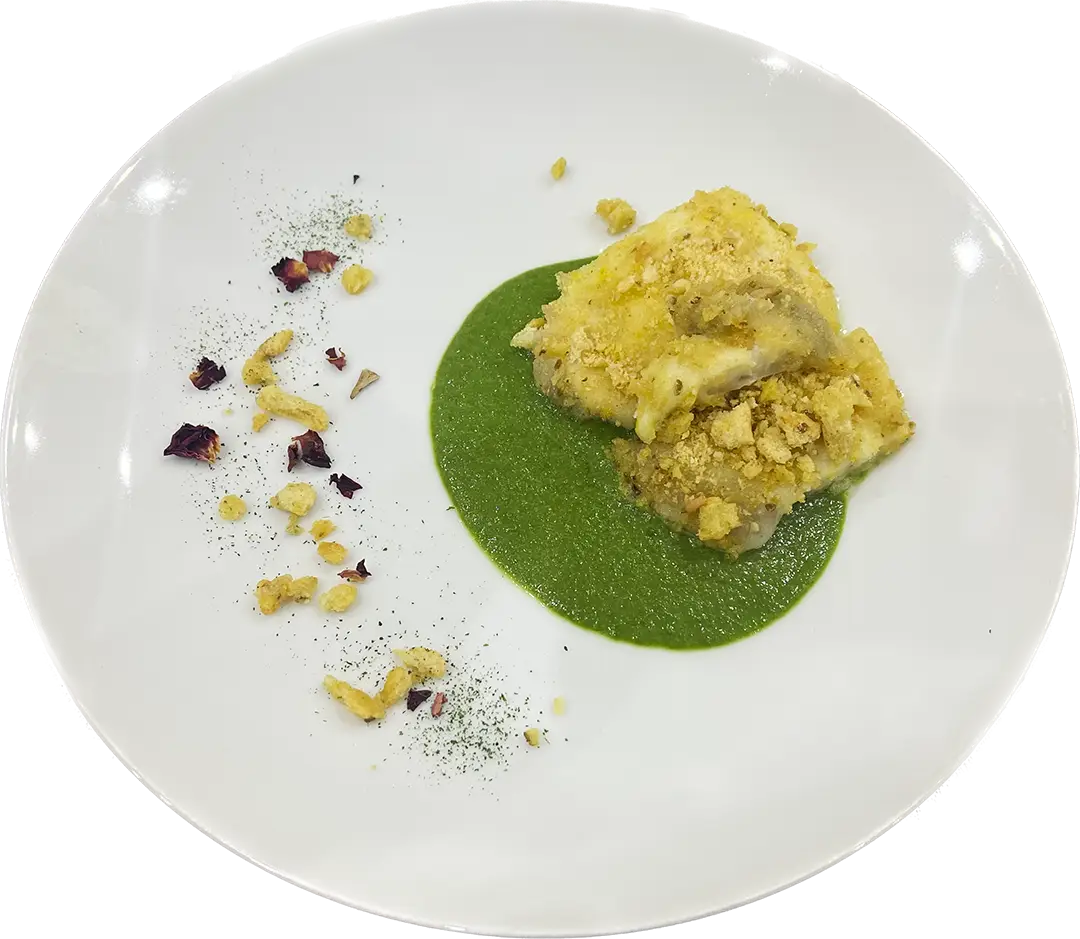 Rombo in crosta di pane e limone su salsa di scarole