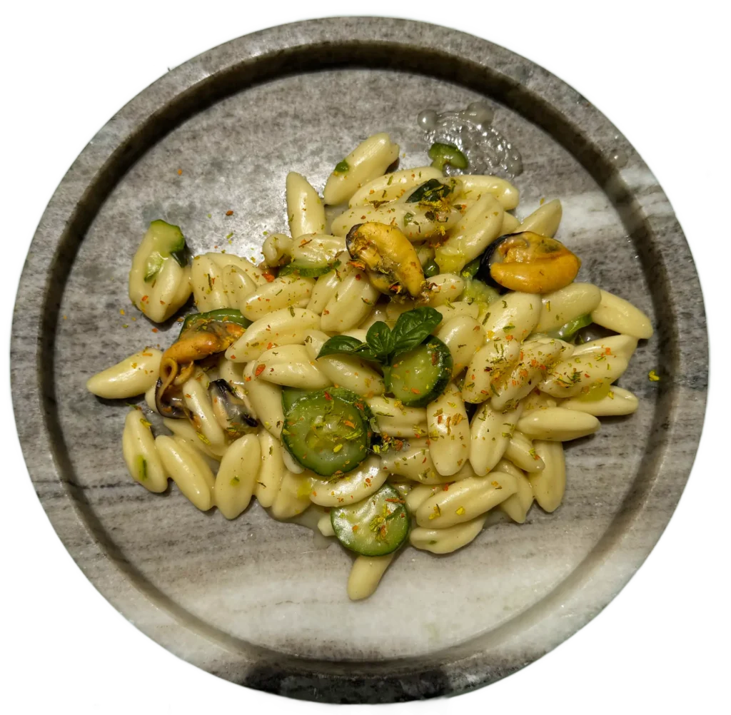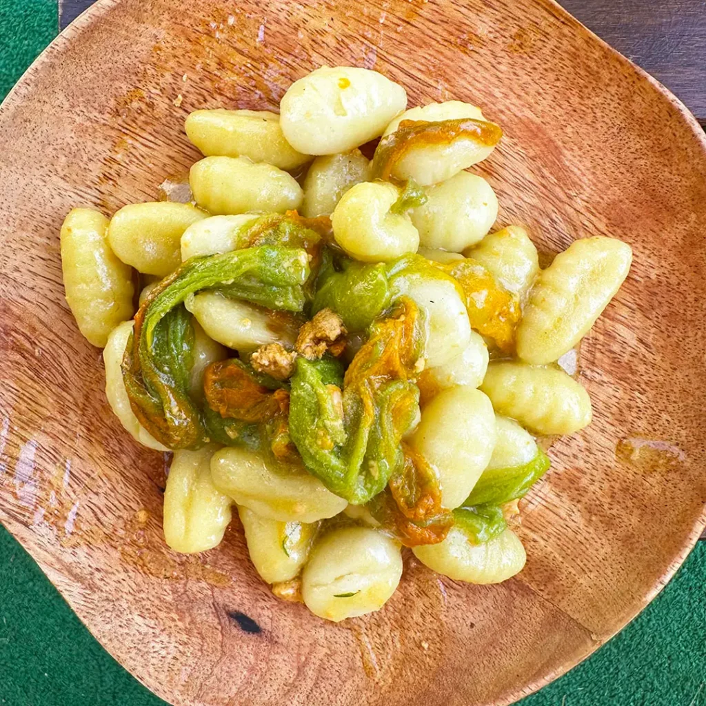 Gnocchi zucchine cozze e polvere di fiori di zucca
