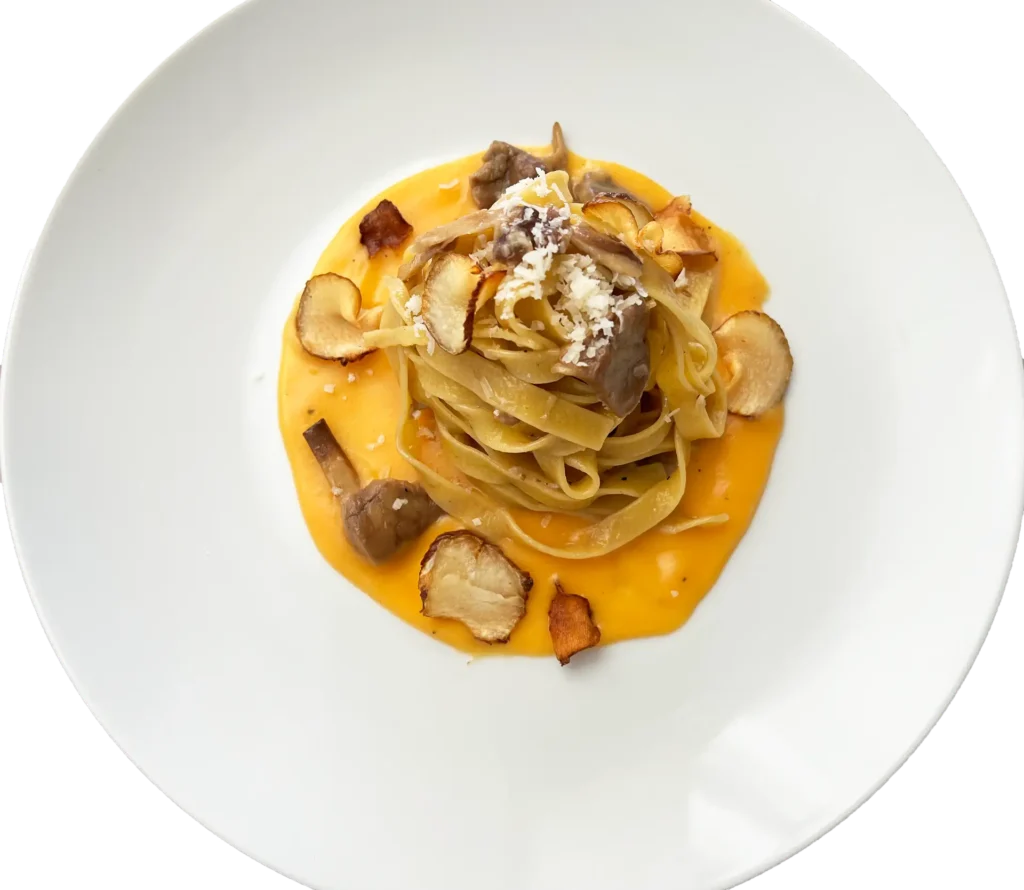 Tagliatelle funghi pioppini crema di zucca e chips di topinambur