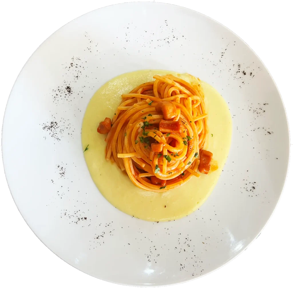 Spaghettone di Gragnano con totani della costiera crema di patate e aroma di caffè