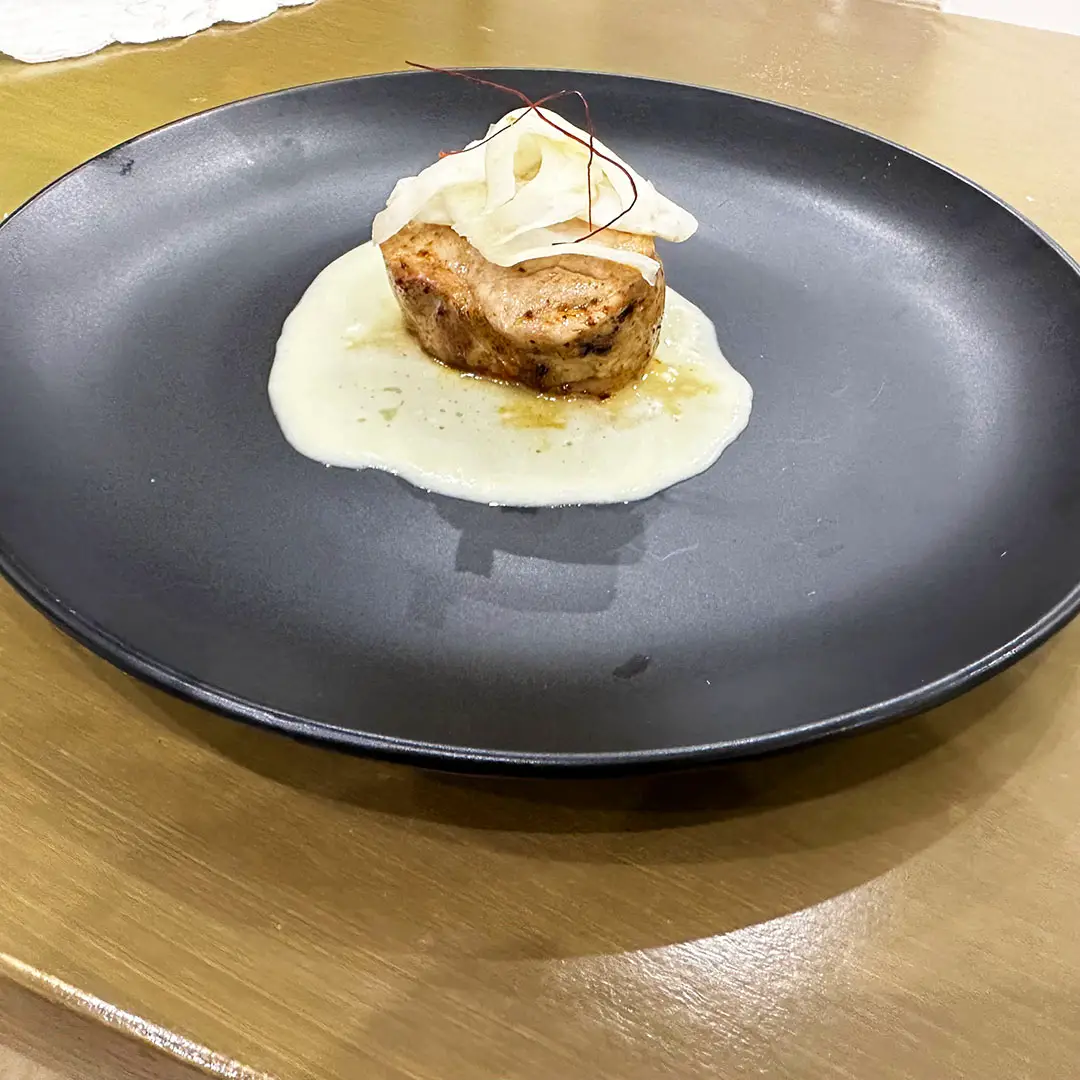 - impiantiamo diponendo sul fondo del piatto la crema di podolico adagiamoci sopra il filetto di maiale e completiamo con i finocchi canditi