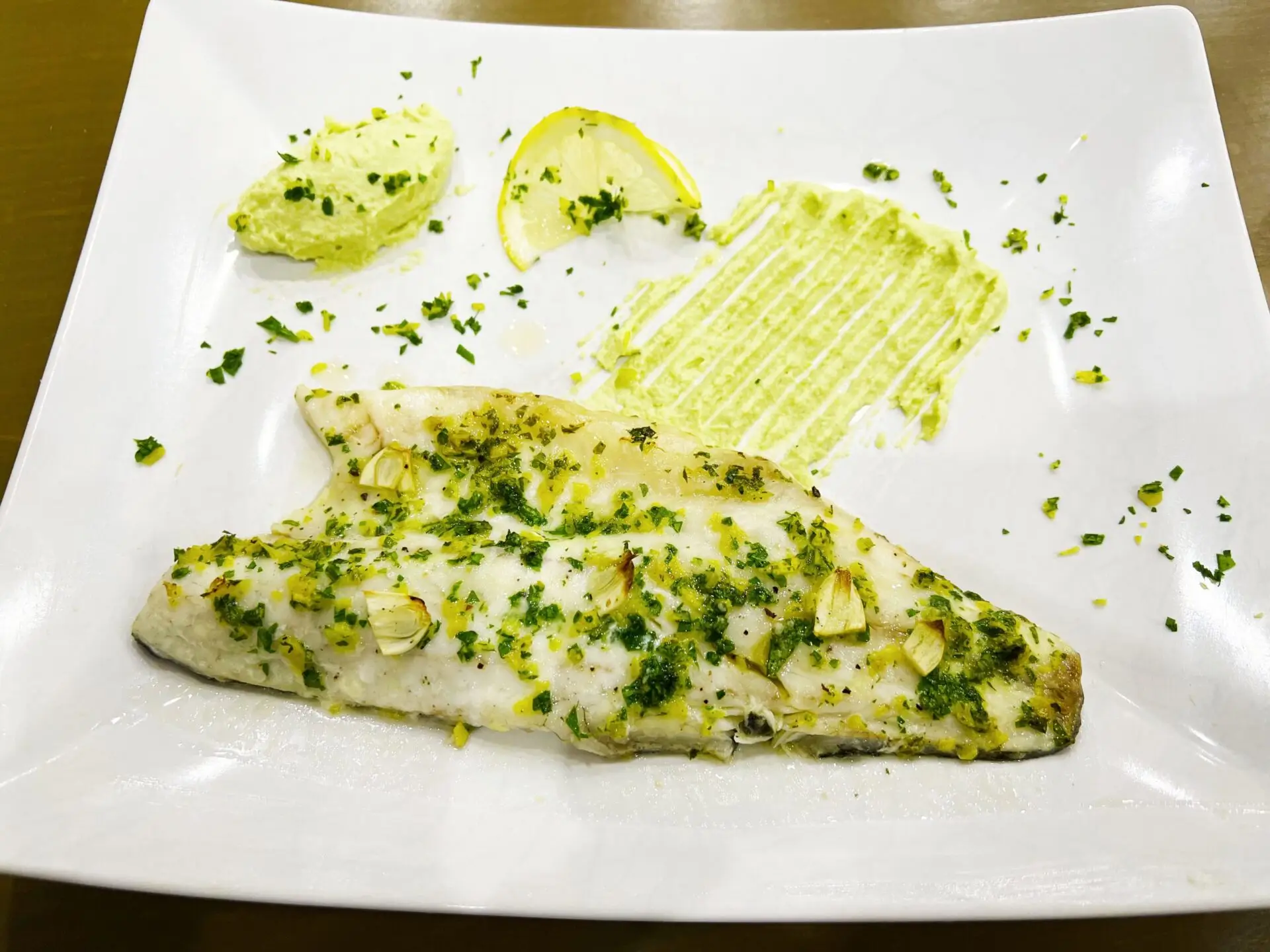Filetto di Spigola al profumo di Catalanesca IGT e limone con quenelle di Avocado