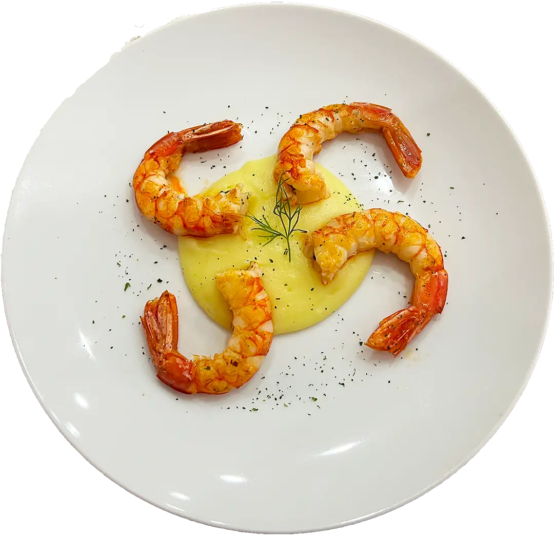 - nel piatto disponiamo la nostra crema di patate e adagiamoci sopra i gamberoni