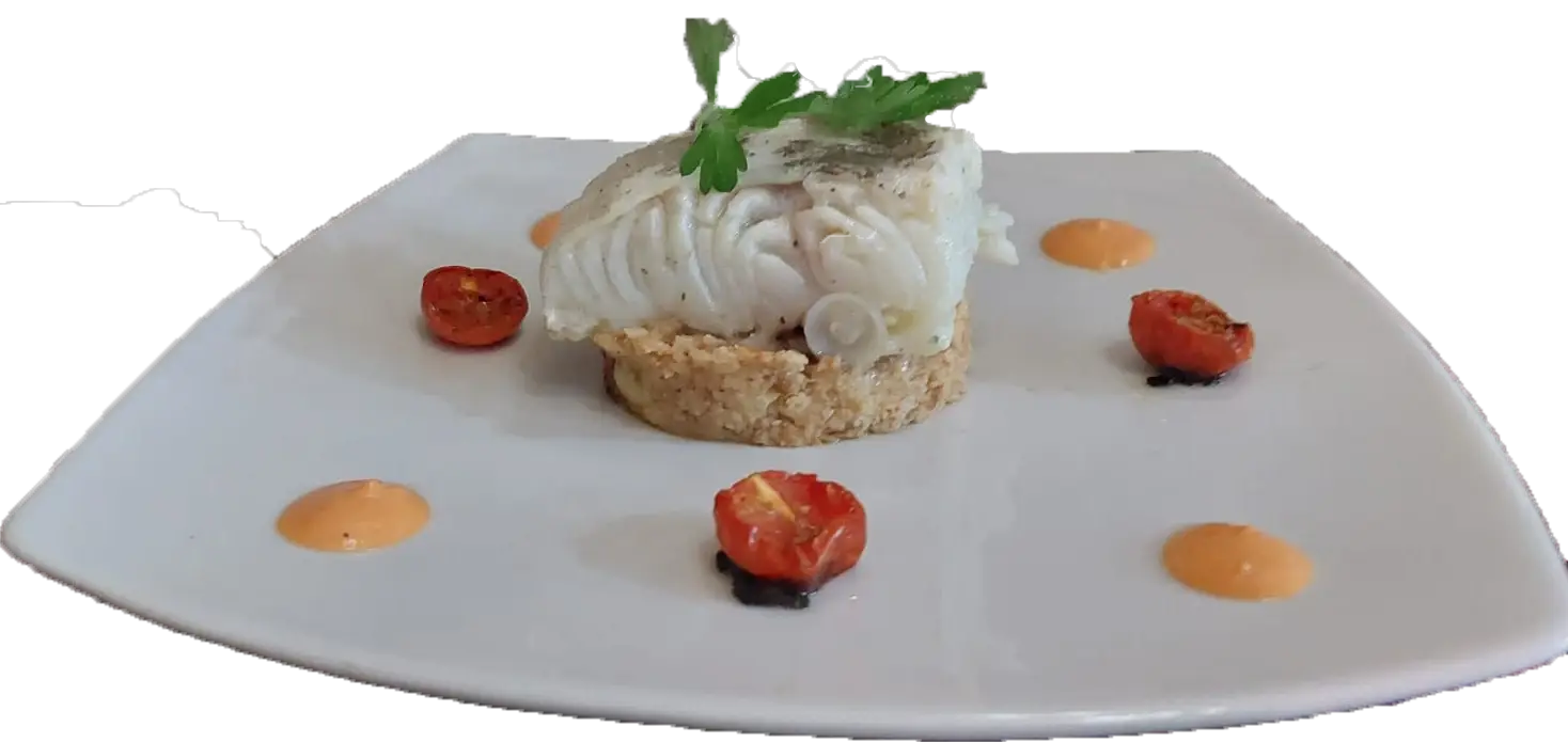 - in un piatto aiutandovi con un coppa pasta create una basa con la panzanella, adagiateci sopra il filetto di baccalà e decorate con la maionese di pomodorini