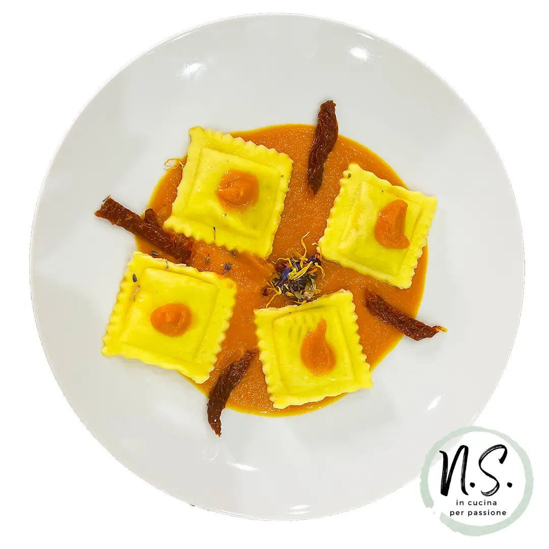 Ravioli baccalà e bufala con crema di zucca e pomodoro secco