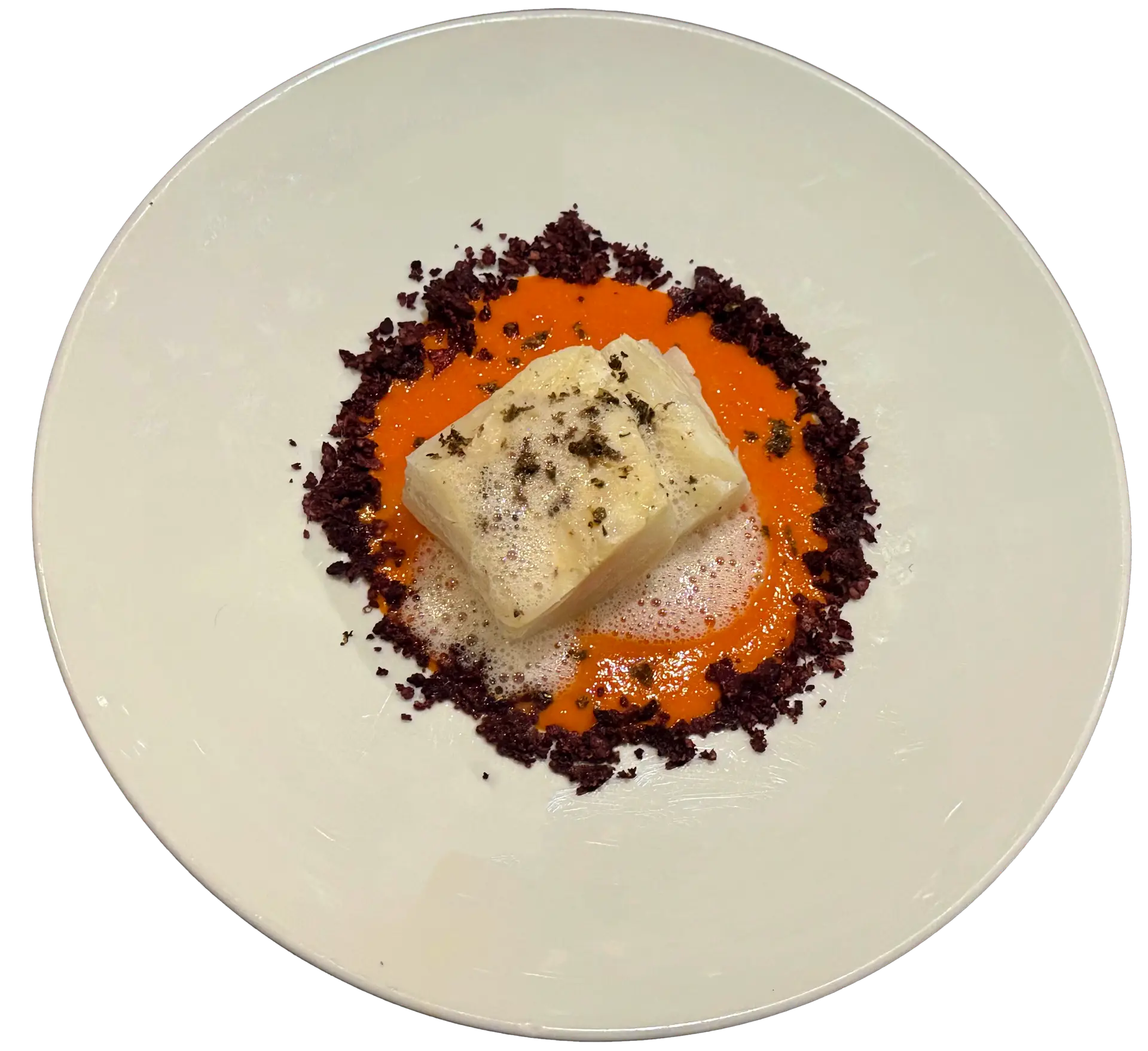- Sul piatto, disponiamo uno strato di crema di pomodorini del Piennolo. Adagiamo sopra il trancio di stoccafisso cotto a bassa temperatura. Decoriamo con il crumble di olive nere e il gel di vino bianco per completare con eleganza.