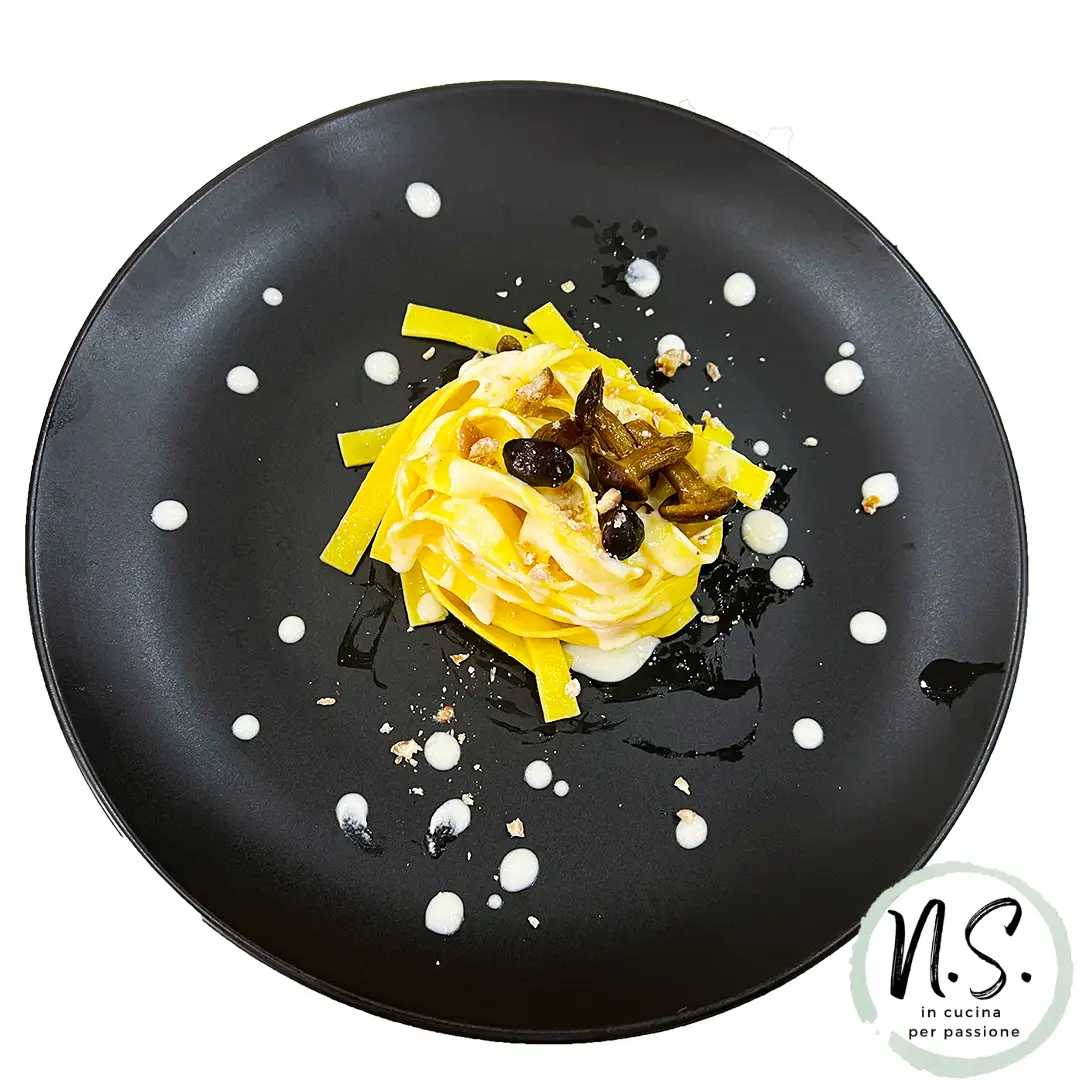 Tagliatelle pioppini fonduta di provolone del monaco e sbriciolata di castagne