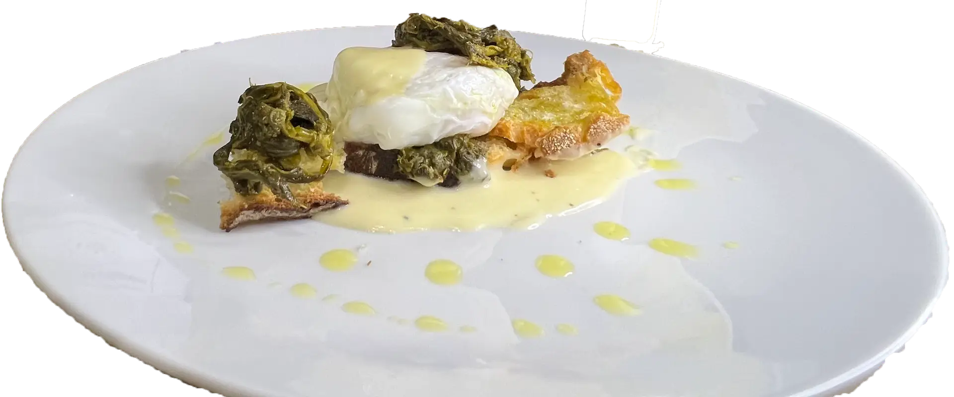 Uova pochè su pane cafone aromatizzato al limone fonduta di parmigiano e friarielli