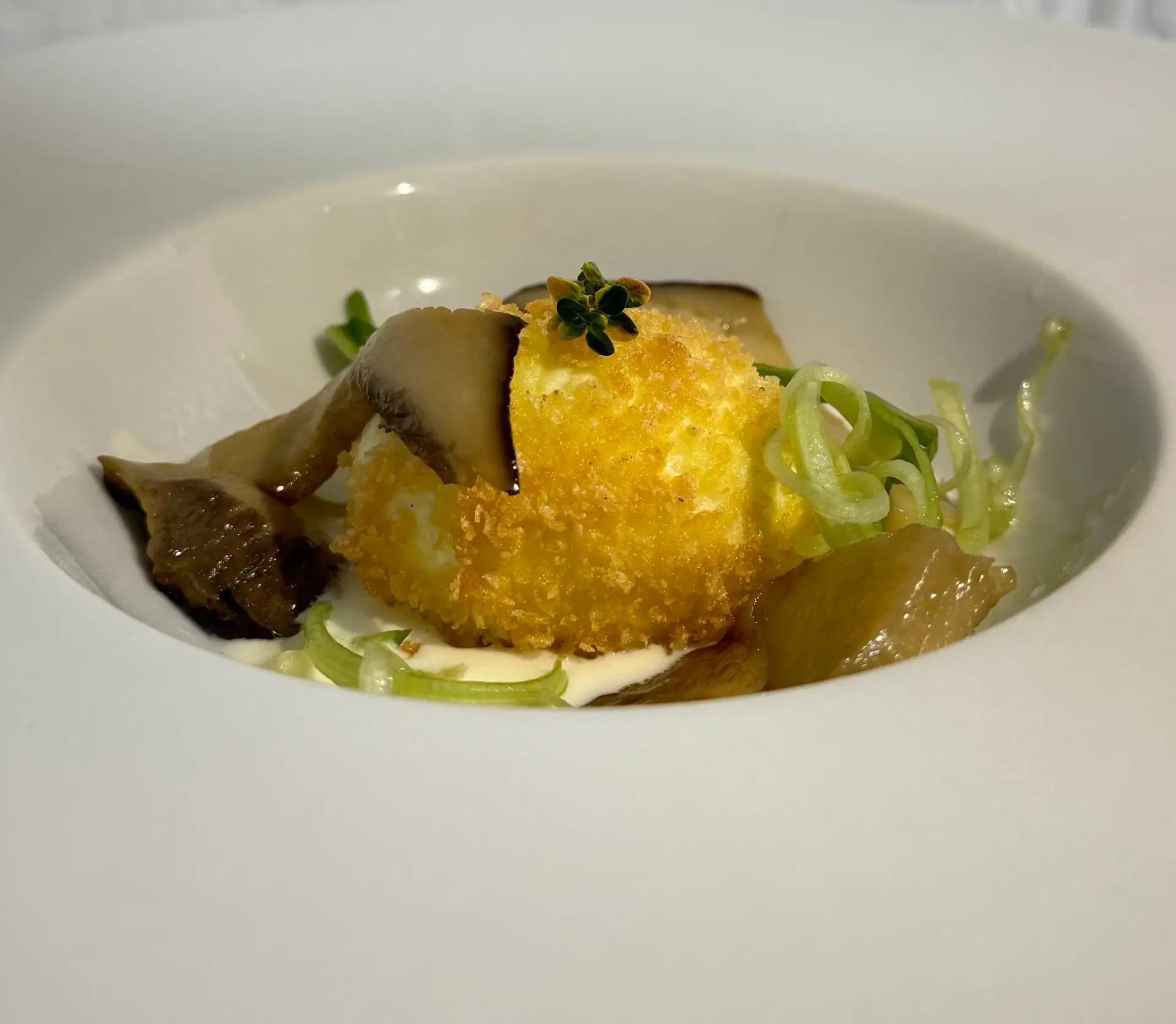 Uovo Croccante, Fonduta di Pecorino, funghi carboncelli e puntarelle al limequat
